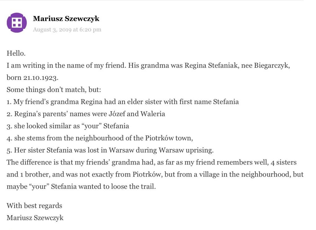 The above reply, received following the publication of my original article generated some excitement. It is quite possible that the names Josef/Jerzy could have been misread or misrembered. Stefania may only have spoken of one sister and one brother. Unfortunately the writer failed to respond to further communications. I appeal to him to write again or indeed anyone who has any information.