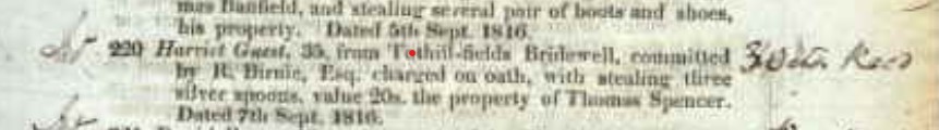 The Newgate Calendar of Prisoners, 1785-1845 contains a notice of Harriet’s crime, the theft of three silver spoons valued at 20 shillings (£1), a sum of course, far greater in value then than today.
