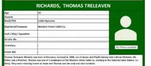 “Thomas Treleaven Richards was born in 1898 in Penzance, Cornwall to James Richards and Phyllis Harvey Cattran. James was a Postman who had retired by 1918. In the 1901 and 1911 censuses Phyllis was a Grocer’s Shop Assistant. Thomas was the youngest of their seven children. In 1901 an older brother was a Telegraph Messenger in the Post Office.