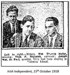 On the 10th of October 1918 the three were returning home [to England] for a fortnight’s holiday and were travelling on RMS Leinster. Three other telegraphists who had recently graduated from the Irish School of Telegraphy in Cork were also on board the Leinster: Anthony Baker, Anthony Jones and Ralph Murray were all from Waterville where their fathers were working as Telegraphists in the Cable Station. The two groups may have known each other already, and in an affidavit to a probate hearing on Anthony Baker in December 1918, Thomas Richards said that they met up on board the ship. Of the six, only Richards survived the sinking, though the bodies of Anthony Jones and William Heller were recovered.
